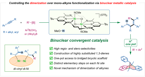 图1. 双核镍催化炔烃的二聚-氢碳官能化反应