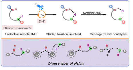 可见光介导的氢原子转移(HAT)过程,可以通过自由基物种活化碳(sp³)-氢键,因其反应温和性和特殊选择性,已成为碳-氢键活化领域中一个非常实用的策略。与杂原子自由基促进的HAT过程相比,由于碳(sp³)-氢键之间的键解离能差异小,碳(sp³)中心自由基促进的HAT过程更具挑战性。另外,在光催化背景下的碳基自由基介导的HAT反应中,碳(sp³)自由基的生成长期依赖于单电子转移过程,制备合适的自由基前体来产生碳基自由基就显得非常必要的。近些年,烯烃通过能量转移过程生成的碳中心双自由基物种被应用于多种转化反应中(例如环加成反应和异构化反应),然而利用此类简单易得的碳(sp³)中心双自由基来诱导HAT反应却鲜有研究,相关报道较为匮乏。