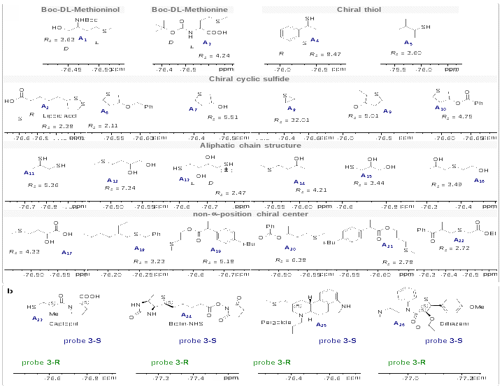 图2. 含氟手性铂探针对一系列硫醇及硫醚分析物的手性检测