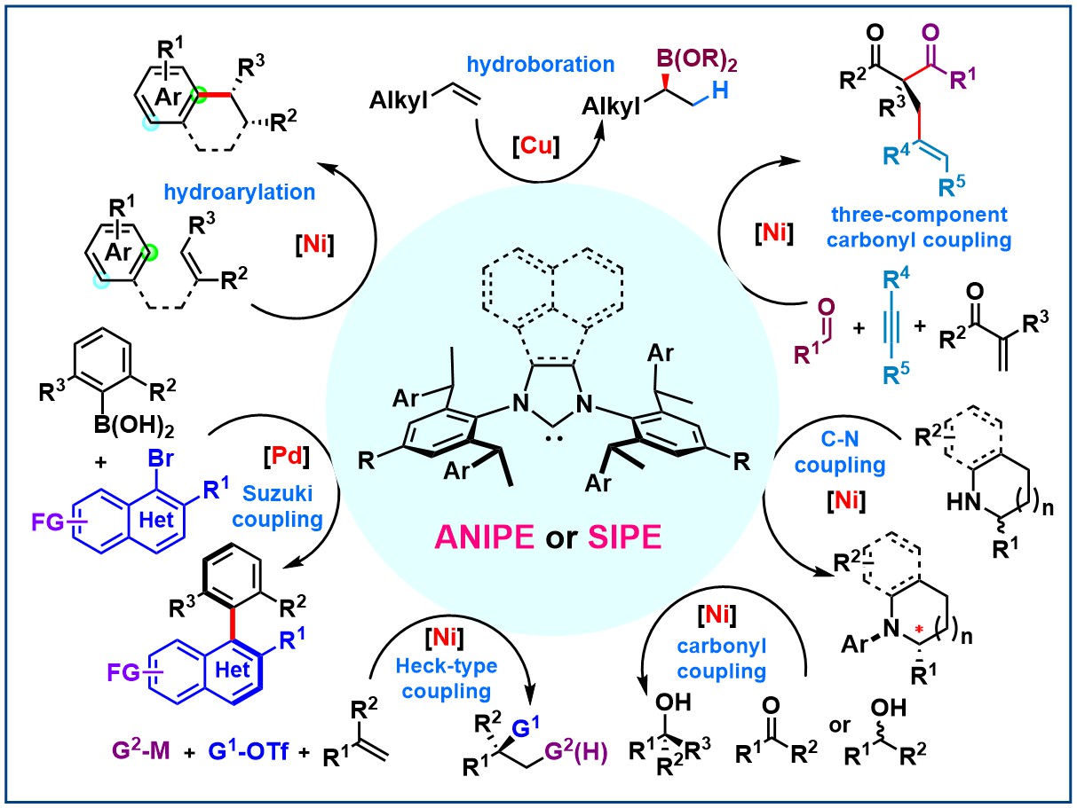 过渡金属催化的不对称反应为手性分子的精准构筑提供了重要的合成方法。其中,手性催化剂的创制是不对称反应的研究核心,在发展新型转化方面发挥了关键作用。氮杂环卡宾(NHC)配体是强的σ-供体,能够实现稳定的金属配位;其独特的空间排列能够有效靠近金属催化中心。因此,NHC配体是金属催化中广为应用的配体。然而,手性NHC配体的开发仍然相对有限,尤其缺少优势手性NHC配体。近年来,中国科学院上海有机化学研究所施世良课题组提出了“诱导契合催化”概念,基于优势手性片段的配体设计新策略,发展了ANIPE和SIPE系列原创性手性NHC配体,并将其应用于金属催化的不对称偶联、不对称加成、不对称C-H官能团化以及不对称烯烃官能团化反应中。新型ANIPE、SIPE手性NHC配体具有大位阻、供电性强、刚柔并济等特性,可以自适应调控多种基元步骤和反应过渡态,在多种重要且具有挑战性的转化中展现优异的反应活性及选择性控制能力(Science 2023, 379, 662–670; Nature Catalysis2022, 5, 934–942; Nature Catalysis 2023, 6, 1087–1097; Nature Synthesis2024, 3, 1091–1103; Nature Synthesis 2024, 3, 633–642; Nature Synthesis 2025, accepted; J. Am. Chem. Soc.2019, 141, 14938−14945; J. Am. Chem. Soc.2019, 141, 5628−5634; J. Am. Chem. Soc.2021, 143, 11963−11968; J. Am. Chem. Soc. 2022, 144, 13643−13651; J. Am. Chem. Soc.2022, 144, 130−136; J. Am. Chem. Soc.2025, 147, 3023−3031; Angew. Chem. Int. Ed.2018, 57, 1376 –1380; Angew. Chem. Int. Ed.2019, 58, 13433 –13437; Angew. Chem. Int. Ed.2021, 60, 5262–5267; Angew. Chem. Int. Ed.2021, 60, 16077–16084; Angew. Chem. Int. Ed.2023, 62, e202310203; Angew. Chem. Int. Ed. 2025, e202503126; Sci. Bull.2025, 70, 674-682; CCS Chem. 2022, 4, 1169–1179; CCS Chem.2025, 10.31635/ccschem.025.202505591; ACS Catal.2019, 9, 1−6; ACS Catal.2023, 13, 6068−6075; Chem. Sci., 2023, 14, 4390; Chin. J. Chem. 2020, 38, 1035-1039; Chin. J. Chem.2022, 40, 1813-1820; Chin. J. Chem.2024, 42, 2161-2165.)。