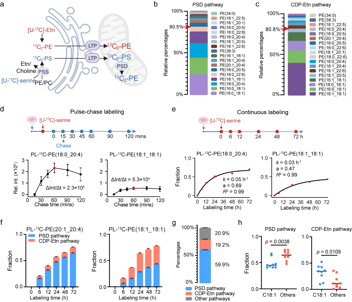 细胞内常见脂质分子在内质网从头合成后,转运至线粒体、溶酶体等其他细胞器。为此,研究团队将亚细胞邻近标记脂质组学技术与稳定同位素示踪标记技术结合,发展出 “邻近标记 +¹³C-同位素” 双标记策略,系统定量表征了脂质分子从内质网到线粒体、溶酶体、细胞核等亚细胞器的转运规律(包括转运速率、周转等),并首次定量分析了各种脂质合成途径和运输途径对特定细胞器脂质组成的贡献比例(图 2)。具体而言,脉冲-追踪实验(Pulse-chase labeling)表明,磷脂酰丝氨酸(PS)由内质网向线粒体的转运在1小时内快速进行,且存在脂肪酰基链偏好性。而连续标记实验(Continuous labeling)通过检测多个时间点线粒体、细胞核、溶酶体中双标记磷脂酰乙醇胺脂质(PL-¹³C-PE lipids),并利用一阶速率方程定量分析了内质网内CDP-ethanolamine合成途径(the CDP-Etn pathway)与线粒体内磷脂酰丝氨酸脱羧酶合成途径(the PSD pathway)对多种细胞器内磷脂酰乙醇胺(PE)脂质的贡献。研究结果表明,线粒体中PE类脂质主要来源于 PSD合成途径,而细胞核与溶酶体中 PE 脂质主要来源于CDP-Etn合成途径。值得注意的是,线粒体中CDP-Etn合成途径偏向贡献含C18:1脂肪酰基链的 PE 类脂质,PSD合成途径则相反。进一步,该方法揭示脂质转运蛋白 VPS13A 和 PDZD8 在维持内质网与线粒体间脂质转运中起关键作用,且具有脂肪酰基链选择性。此外,该方法还发现,mTOR 激活可特异性提高溶酶体中胆固醇、PE类脂质 和 PS类脂质的含量,而不影响整个细胞内脂质含量,为细胞器介导的脂质代谢研究提供了有力技术支撑。