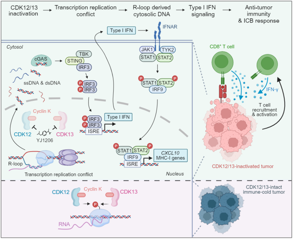 细胞周期蛋白依赖性激酶12(CDK12)及其旁系同源蛋白CDK13通过磷酸化RNA聚合酶II调控转录延伸和持续合成能力,是多种癌症的潜在治疗新靶标。在晚期前列腺癌和卵巢癌中,CDK12失活突变定义了独特的疾病分子亚型。研究表明,CDK12失活与晚期前列腺癌肿瘤内T细胞水平升高相关。我们前期工作发现,小鼠前列腺上皮细胞中Cdk12基因缺失会诱发伴有淋巴细胞浸润的癌前病变,且CDK12与CDK13存在旁系同源合成致死关系。然而,这些表型背后的机制及其治疗意义尚未明确。近期,中国科学院上海有机化学研究所生命过程小分子调控全国重点实验室丁克课题组和密西根大学Arul M. Chinnaiyan团队合作,揭示了CDK12/13失活在临床前模型中激活STING介导的抗肿瘤免疫的分子机制(J. Clin. Invest.2025. DOI: 10.1172/JCI193745)。