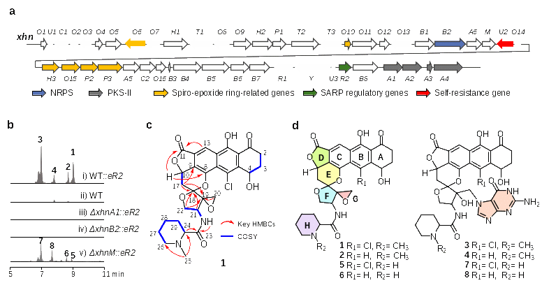 含有环氧结构的星海卡辛对多重耐药菌株,包括金黄色葡萄球菌MRSA和表皮葡萄球菌MRSE,展现出显著的抗菌活性。它们对多种癌细胞系亦表现出强效的细胞毒性。此外,研究者们进一步揭示了星海卡辛的DNA烷基化机制:星海卡辛的环氧结构可被鸟嘌呤进攻从而形成DNA-星海卡辛的复合物。最后,研究者们还发现HTH-42超家族蛋白XhnU2能够解离DNA-化合物加合物,从而缓解星海卡辛的毒性,进一步明确了其自抗性机制。