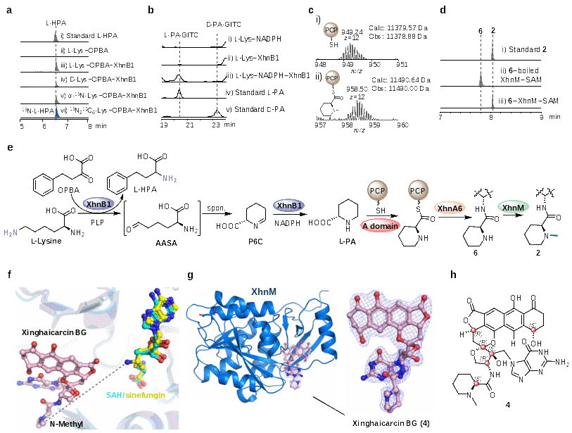 在对星海卡辛类化合物的生物合成机制研究中,研究人员发现该类化合物由II型聚酮合酶-非核糖体肽合成酶(PKS-II-NRPS)杂合体系协同组装而成。转氨还原双功能酶 XhnB1、NRPS模块蛋白 XhnB2 以及KSIII型酶 XhnA6 共同参与L-哌啶酸结构单元的生物合成与上载,从而构建聚酮–非核糖体肽类核心骨架。后续由甲基转移酶 XhnM 催化完成N-甲基哌啶酸单元的形成。随后,研究人员通过解析XhnM与星海卡辛-碱基加合物的共晶结构,明确了星海卡辛中六个手性中心的立体构型,为其立体化学确证提供了坚实依据,并为不稳定天然产物的立体化学解析提供了新思路。