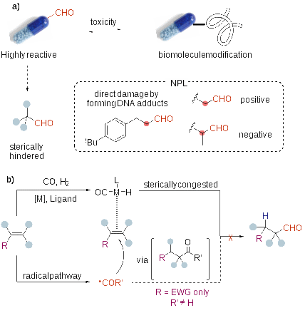 醛基作为关键药效团广泛存在于抗肿瘤、抗感染药物中,但其高反应活性易与生物大分子发生脱靶共价结合,导致毒副作用(图1a)。研究表明,通过在醛基α位引入大位阻基团产生空间屏蔽效应,可同时保留药物活性并显著降低反应性,为药物安全性设计提供新路径。然而,传统金属催化氢甲酰化难以克服大位阻烯烃的空间排斥,现有自由基氢酰化体系无法实现非活化大位阻烯烃转化(图1b)。