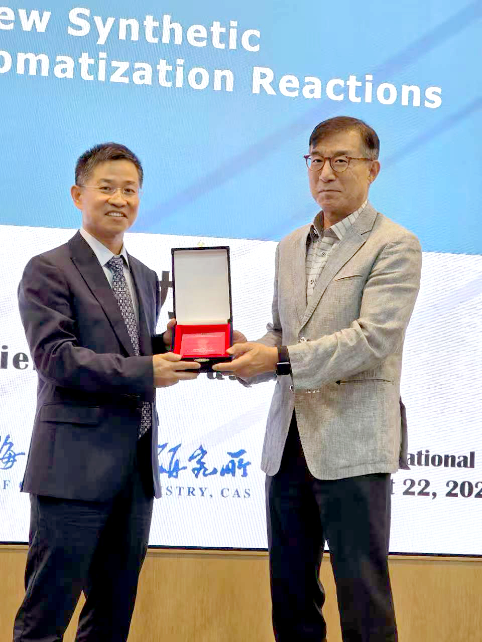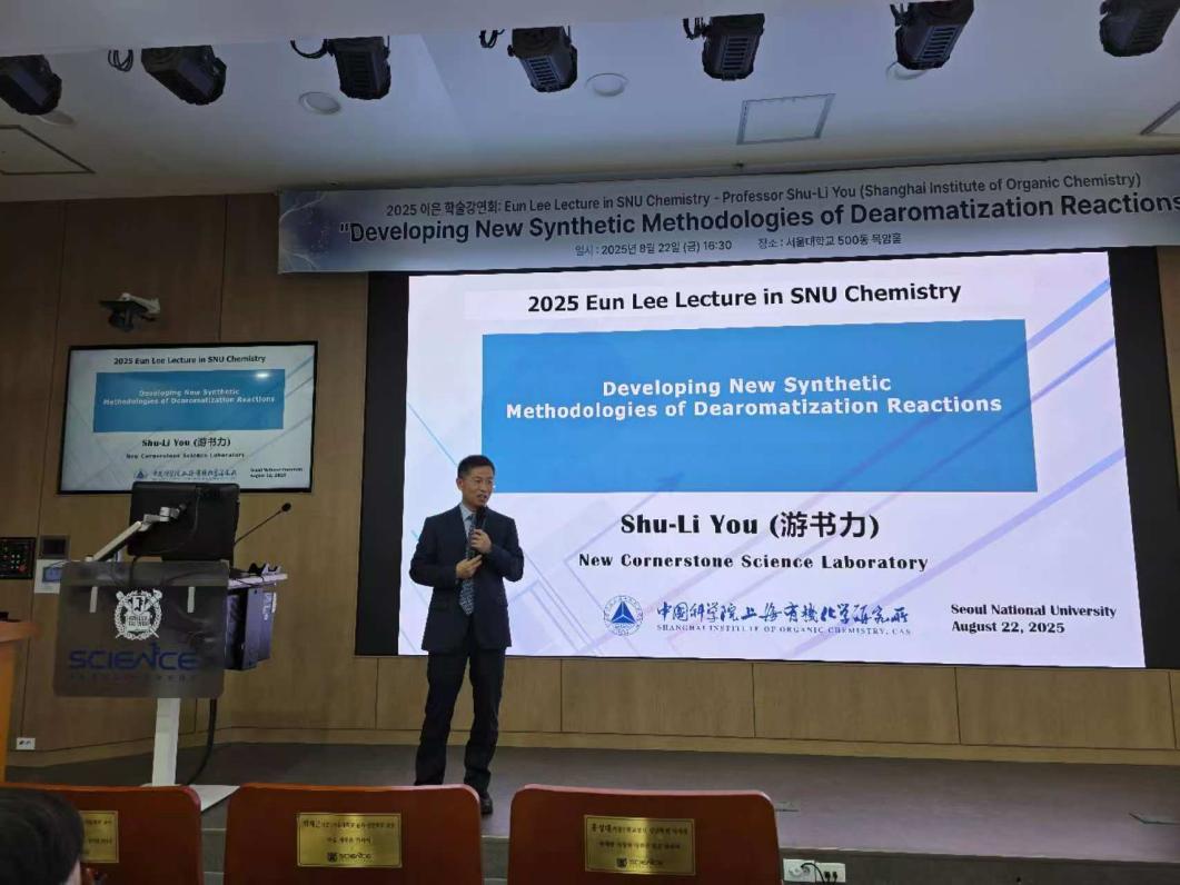2025年8月22日,第十一届Eun Lee Lectureship颁奖仪式在韩国首尔国立大学举行。中国科学院上海有机化学研究所游书力研究员以其在有机合成和催化领域的杰出贡献,被授予Eun Lee Lectureship Award,并应邀在颁奖仪式后做题为“Developing New Synthetic Methodologies of Dearomatization Reactions”的学术报告。首尔国立大学Byeong Moon Kim教授为游书力研究员颁发获奖证书。