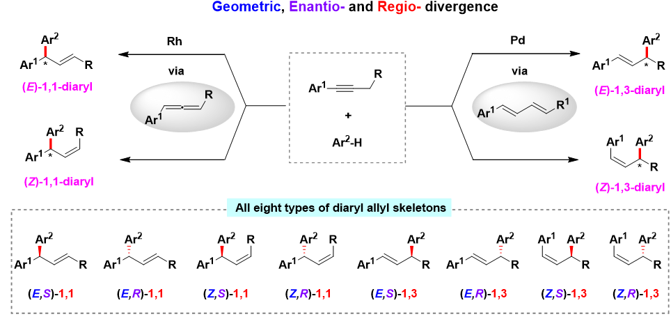 不对称ƞ3-取代反应是构建手性不饱和片段的一条重要途径。何智涛课题组一直致力于非经典ƞ3-取代反应研究,突破经典模式下的底物离去基限制和选择性控制难题。前期发展了一系列催化转化策略 (JACS,2021, 143, 7285; Nat. Commun. 2021, 12, 5626; Nat. Synth. 2023, 2, 37; ACIE,2023, 62, e202215568; JACS,2023, 145, 3915; ACIE, 2023, 62, e202301556; ACIE, 2023, 62, e202307628; Nat. Commun. 2023, 14, 6303.; ACIE, 2023, 62, e202314517; Nat. Synth.2024, 3, 1011; JACS,2024, 146, 29857; ACIE,2025, 64, e202413428)。在此基础上,该课题组进一步探索内炔烃的发散性氢杂芳基化反应,开发了一种催化剂控制的区域、立体、几何三维可控合成策略,可同时制备出八种不同的二芳基烯丙基骨架,将化学选择性合成提高到一个新的层次 (Nat. Synth.2025, 4, doi.org/10.1038/s44160-025-00870-z)。