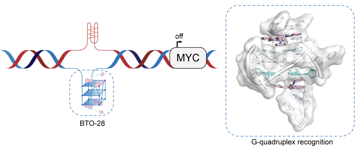 癌基因MYC在细胞增殖、代谢和分化等多种生物学过程中发挥关键作用,同时也是人类肿瘤中最常被激活的癌基因之一。长期以来,MYC被认为是一个极具潜力但充满挑战的治疗靶点。尽管抑制MYC的策略已取得重要进展,目前尚未有针对MYC驱动肿瘤的有效靶向药物问世。其主要原因在于MYC蛋白缺乏传统意义上的小分子结合口袋,难以通过直接抑制实现药物设计。在多数人类癌症中,MYC的失调并非源自基因突变,而是受上游致癌信号通路激活所致。靶向MYC启动子区域 G-四链体结构,借助基因沉默下调MYC的转录与表达,被认为是一种前景广阔的治疗策略。