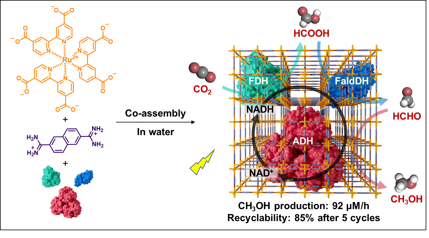 该工作受羧酶体启发,通过水相中基于氢键相互作用的自组装,利用脒基单体、羧基单体与甲酸脱氢酶(FDH)、甲醛脱氢酶(FaldDH)及醇脱氢酶(ADH)的电荷增强氢键,原位一锅法共组装实现基于多酶-光活性框架体系的人工光合系统制备。基于联吡啶钌基元的氢键有机框架富集了光催化活性中心,能够在水相条件下实现高效的辅酶因子NAD+还原进而再生NADH, 还原速率达到4.5 mM/h。进一步,通过与FDH 的整合,利用光活性框架再生NADH以推动FDH持续消耗NADH还原二氧化碳, 进而实现高效的光催化二氧化碳还原制备甲酸。基于光催化位点与酶催化位点拉近效应,增强了光合体系催化制备甲酸的活性,催化HCOOH转化频率(TOF)能够达到681 h-1。此外,通过整合FDH、FaldDH和ADH三酶级联体系,实现多种蛋白共组装到框架中。通过共聚焦显微镜实验证明了三种蛋白在框架内部的均一性封装,同时,基于光酶级联催化位点拉近效应,实现了高效光催化酶级联反应还原二氧化碳逐步至甲酸、甲醛到甲醇,其制备甲醇的效率达到92 μM/h, 表观光量子效率达到5.5%,同时经过5次催化循环仍然保持85%催化活性。该模拟天然羧酶体结构的研究提供了一种整合光催化与多酶级联催化构筑高效人工光合系统的新思路,为进一步利用高效光-酶级联体系实现二氧化碳还原到高价值多碳产物铺平了道路。