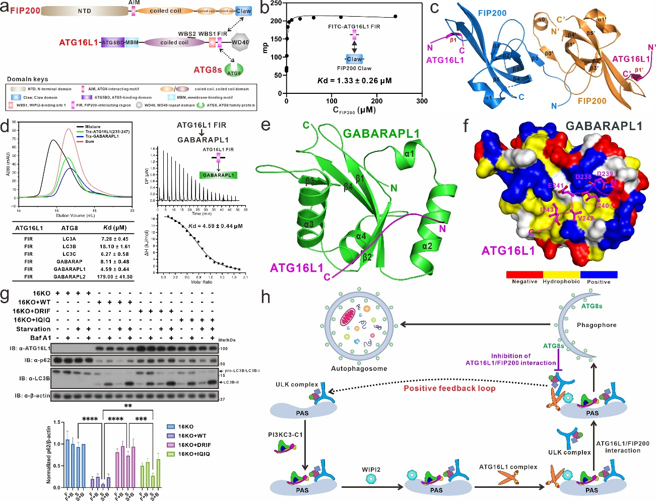 细胞自噬是哺乳动物细胞内一种高度受调控的,利用溶酶体来降解蛋白聚集体、受损细胞器、入侵病原体等无用或有害成分以应对细胞生存压力和维持细胞自身动态平衡的重要代谢过程。细胞自噬在细胞生长、天然免疫、衰老等众多的生理过程中扮演着重要的角色。同时,细胞自噬的功能异常与癌症、神经退行性疾病等诸多的人类疾病密切相关。在经典的氨基酸饥饿引发的巨自噬过程中,细胞通过自噬前体结构(PAS)的引发、延伸进而形成自噬体来包裹细胞内待降解的自噬底物。在PAS的引发和延伸阶段,WIPI2和FIP200均通过与ATG16L1的相互作用,将ATG12~ATG5-ATG16L1复合物(ATG16L1复合物)招募至PAS上,进而使其实现对ATG8家族蛋白的脂质化修饰。中国科学院上海有机化学研究所生命过程小分子调控全国重点实验室的潘李锋研究组长期致力于细胞自噬的分子机制研究,课题组前期的研究工作已详细阐明WIPI2招募并激活ATG16L1复合物的分子机制(Science Advances. 2023, 9(9):eadf0824;Autophagy. 2023, 20(4):938-940.)。但是,过去对于FIP200在ATG16L1复合物被招募至PAS过程中的具体分子机制仍不清楚。
