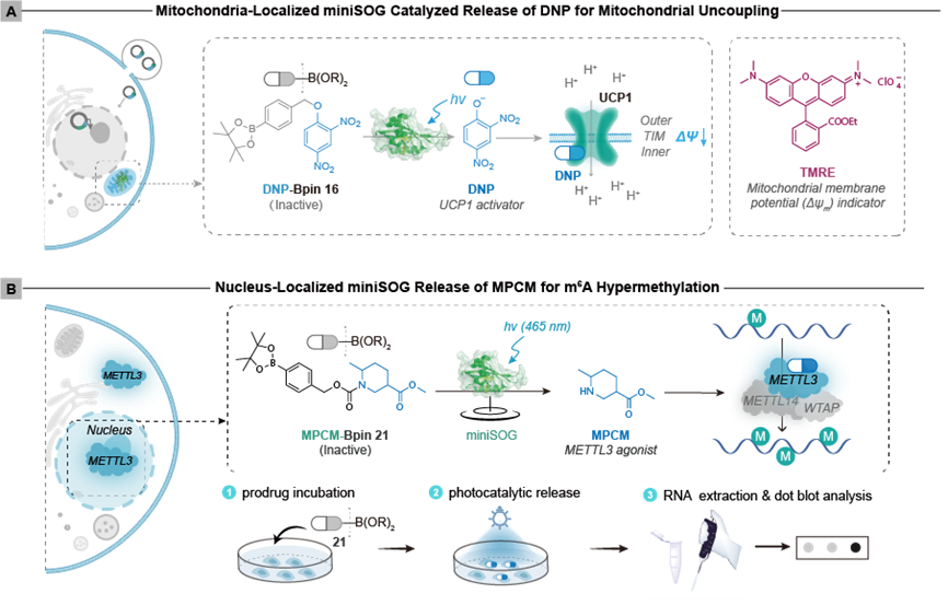图1:miniSOG介导生物正交光催化实现细胞器靶向调控示意图