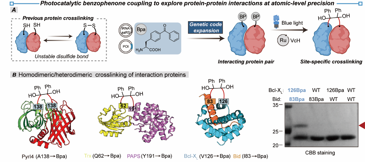 本技术以极简操作实现高效、精准的蛋白质交联:仅需在目标蛋白单一位点嵌入光交联探针苯甲酮丙氨酸(Bpa),即可通过光催化高效触发交联反应,显著优于传统多步骤、低特异性的交联方法。在PyrI4同源二聚体及Trx/PAPS异源复合物的研究中,该策略均展现出高度特异性交联,且工程化蛋白完全保持了天然结合亲和力。通过高精度串联质谱分析,研究团队直接鉴定出频哪醇型交联键的形成,成功在原子尺度上解析了蛋白质相互作用界面。这一突破不仅提供了“分子尺”级的精准测量工具,更为动态生命过程研究奠定了新一代方法学基础。