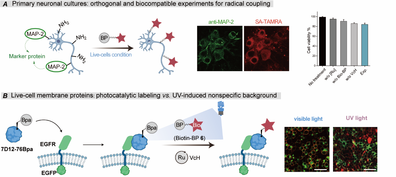 该技术的突破性价值体现在三个核心维度:1)特异性显著提升,将内源性活性氨基酸的非特异性反应降低3–20倍;2)具备优异的生物相容性,在原代神经元模型中实现84%的细胞存活率,信噪比提升超过5倍;3)复杂生物环境适用性,通过将Bpa精准整合至靶向EGFR的纳米抗体7D12,并在EGFR高表达细胞模型中成功验证其功能。该技术为受体靶向药物筛选与精准医学研究提供了关键技术支撑,展现出广阔的转化应用前景。