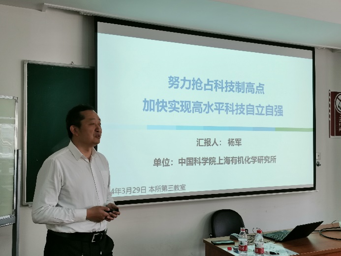 为深入贯彻落实中国科学院2024年度工作会议精神,增强青年学生对抢占科技制高点重要意义的理解,3月29日下午,上海有机所开展“以青年之志抢占科技制高点”主题党日暨研学大讨论活动。活动邀请“黄耀曾绿色高能推进技术攻关突击队”队长杨军研究员作《努力抢占科技制高点,加快实现高水平科技自立自强》主题报告,研究生部主任王娟主持活动。